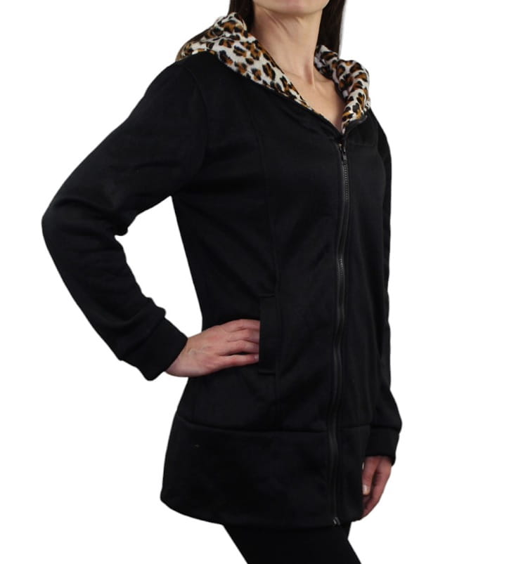 Stylowa bluza damska z kapturem to połączenie klasyki i modnego detalu. Czarny, uniwersalny kolor został przełamany efektownym wnętrzem kaptura w panterkę, co nadaje całości charakteru i wyróżnia ją na tle standardowych modeli.