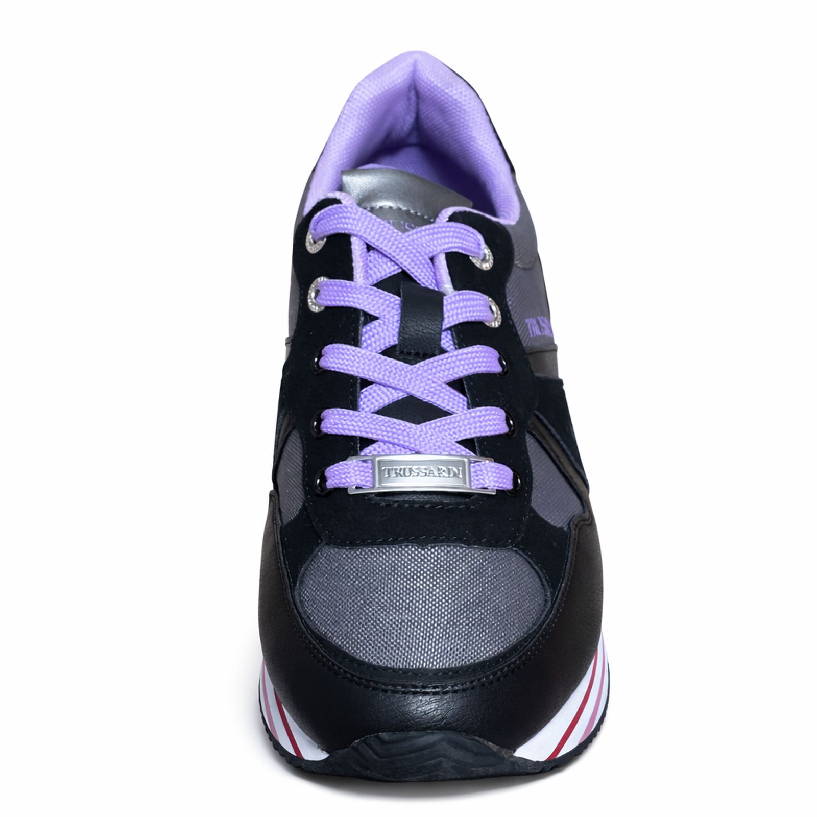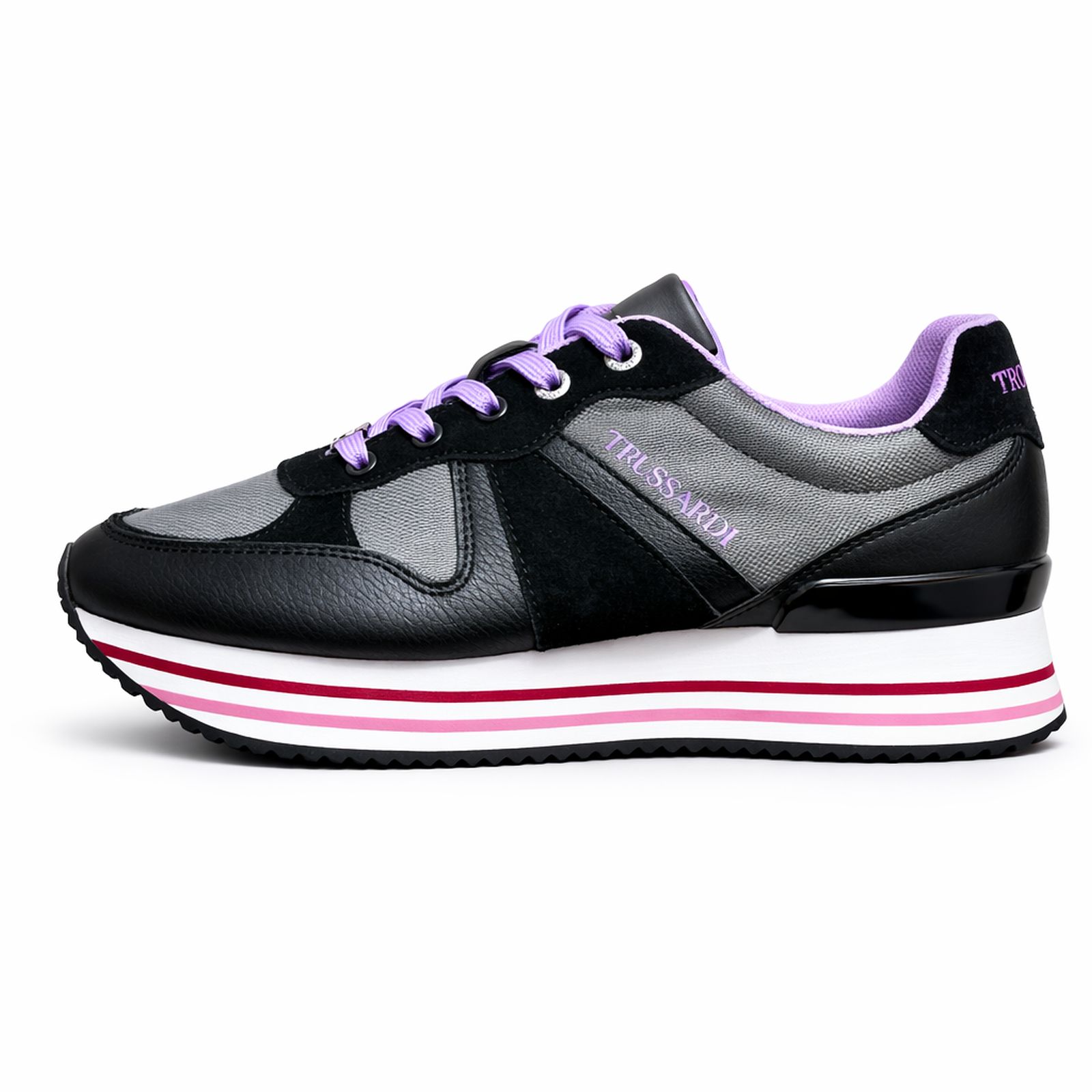 Model Trussardi SNK Clement Black K299 to wyraziste sneakersy damskie łączące elegancką czerń i szarość z energetycznym fioletem. Charakterystyczna platformowa podeszwa z kontrastowymi paskami nadaje sylwetce lekkości i nowoczesnego stylu.