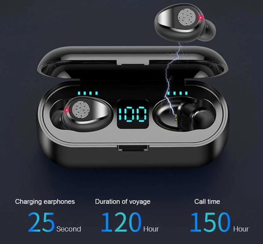 F9 True Bezprzewodowe słuchawki Bluetooth 5.0 Sterowanie dotykiem linii papilarnych Wyświetlacz LED Inteligentne słuchawki douszne z pojemnikiem ładującym - czarny