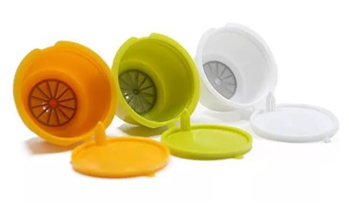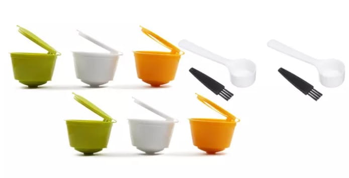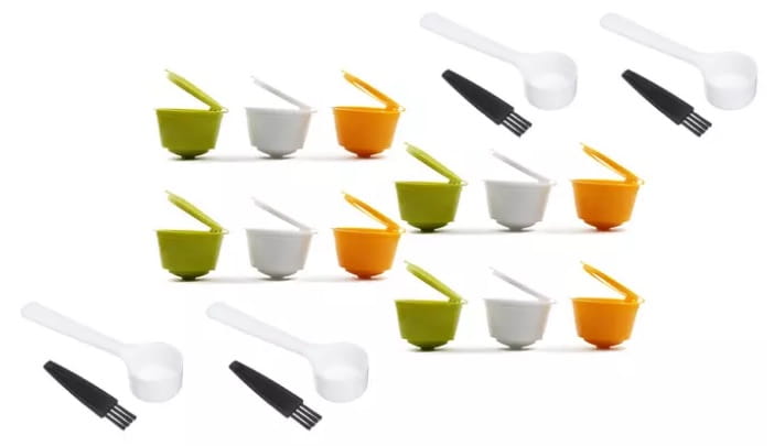 - Jeden zestaw zawiera trzy kapsułki kawy wielokrotnego napełniania, jedną plastikową łyżkę i jeden pędzelek