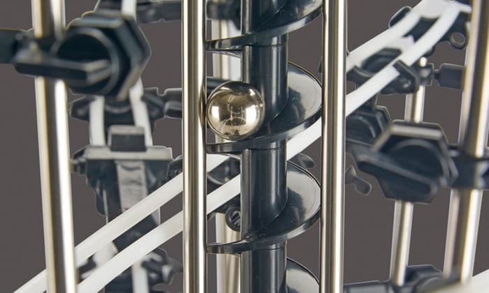- Dwie oddzielne ścieżki sprawiają, że stalowe kulki opuszczają podnośnik na jednym torze, toczą się wokół pętli i wyginają się z radosną prędkością, by powrócić na dno windy, gotowe do podniesienia do drugiej części toru.