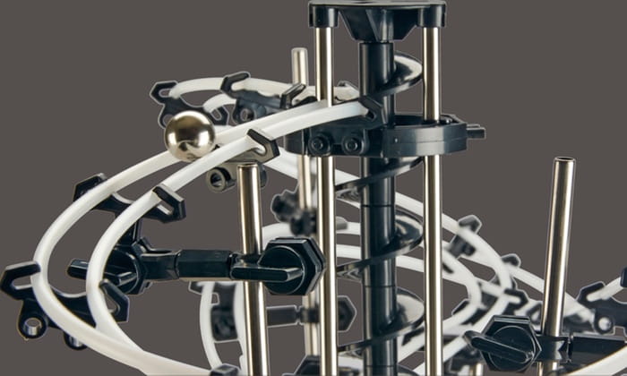 - Przyciąć odcinki toru do właściwego rozmiaru z pojedynczej rolki gęstych plastikowych przewodów tworzących krzywe i pętle utrzymywane w miejscu za pomocą uchwytów szynowych z tworzywa sztucznego, które łączą się z metalowymi prętami utrzymywanymi pionowo w czarnej plastikowej podstawieStalowe kulki toczą się po torze i kierują się do zasilanej bateryjnie windy, która przenosi je na szczyt, aby zacząć wszystko od nowa