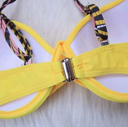 Dwuczęściowy kostium kąpielowy damski JFAN w kolorze żółtym z kolorowymi akcentami to wyjątkowe bikini, które przyciąga uwagę i podkreśla kobiecą sylwetkę. Idealny wybór na plażę, basen oraz wakacyjne wyjazdy.