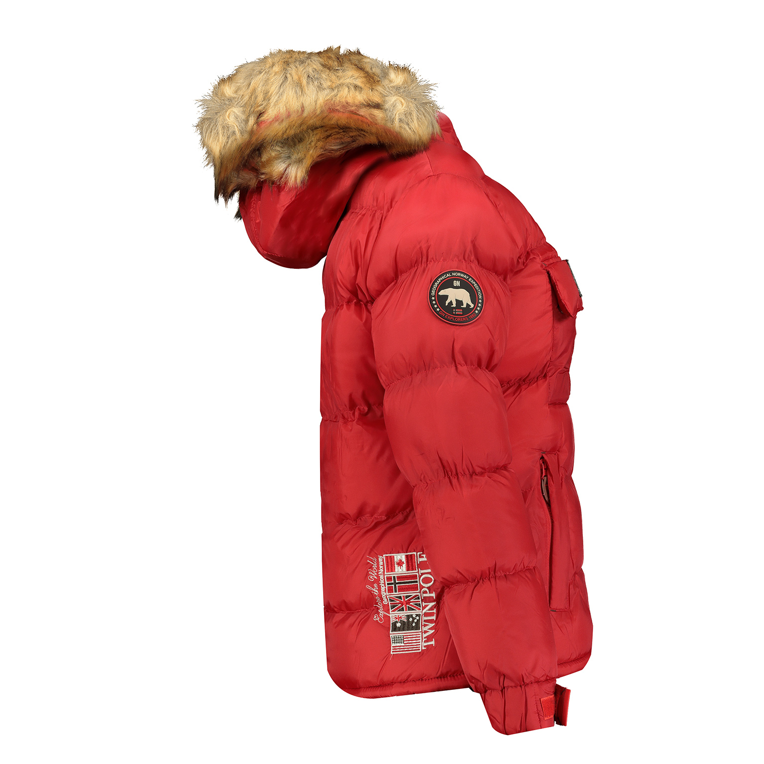 Z przodu znajduje się praktyczna, naszywana kieszeń z haftem, zapinana na rzep – idealna na skipass, telefon lub drobne akcesoria. Dodatkowo kurtka wyposażona jest w dwie boczne kieszenie zapinane na zamek, które umożliwiają bezpieczne przechowywanie niezbędnych rzeczy. Regulowane mankiety oraz regulowany dół kurtki pozwalają na optymalne dopasowanie do sylwetki i lepszą ochronę przed zimnem. Hafty na rękawach oraz detale charakterystyczne dla Geographical Norway podkreślają narciarski, sportowy styl modelu.
