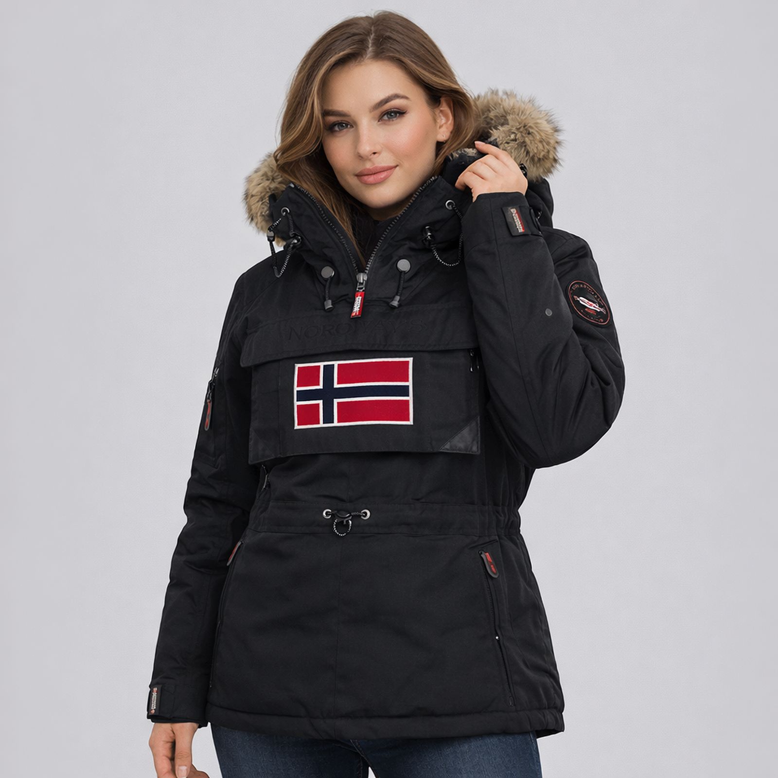 Kurtka wykonana jest z trwałego, 3-warstwowego materiału hydrofobowego, który skutecznie chroni przed śniegiem, deszczem i wiatrem, jednocześnie zapewniając oddychalność podczas aktywności. Regulowana talia i dół pozwalają idealnie dopasować parkę do sylwetki, a kaptur z odpinanym futerkiem dodaje ciepła i stylowego wykończenia.