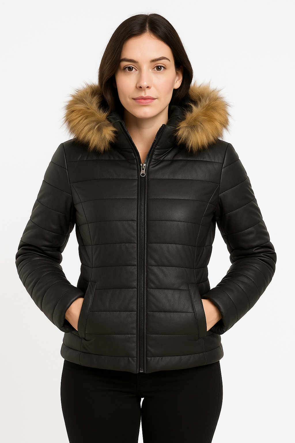 Kurtka damska pikowana ze skóry ekologicznej z futerkiem czarna M