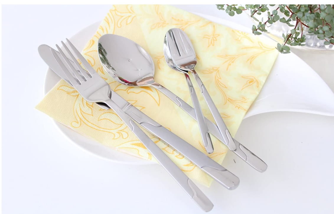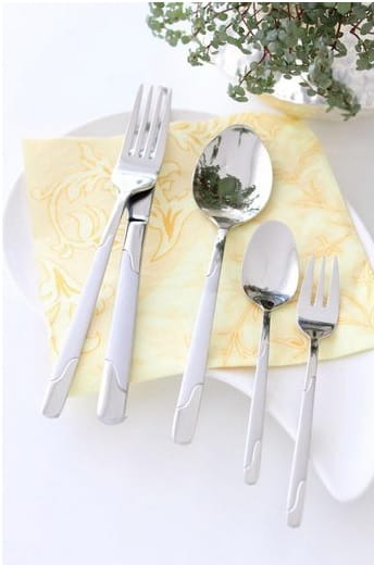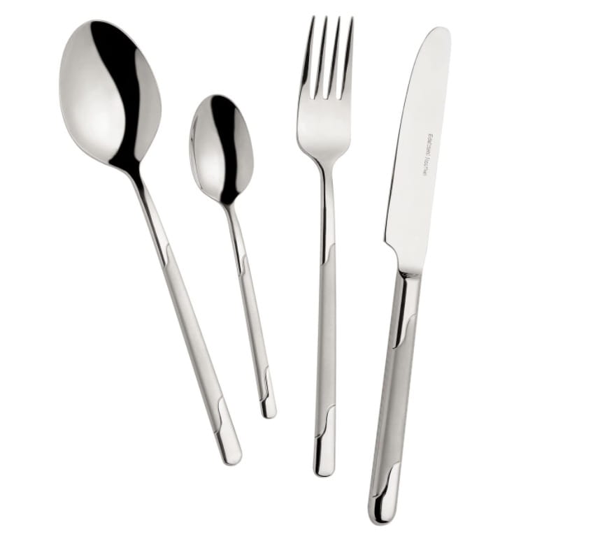 - Sztućce mają wdzięczny kształt, a rączki w kształcie prętów są wąskie, a dzięki zaokrąglonym krawędziom wygodnie leżą w dłoni.