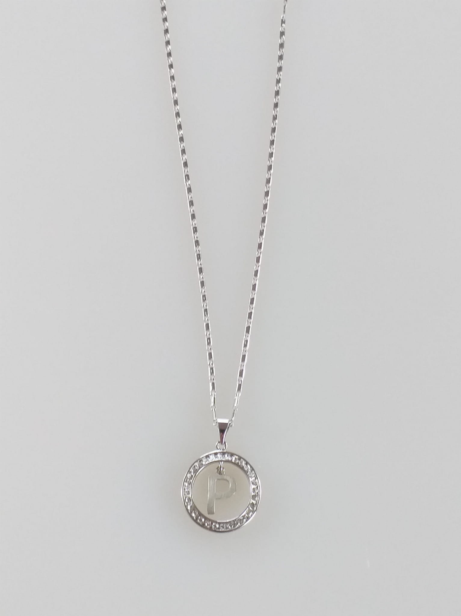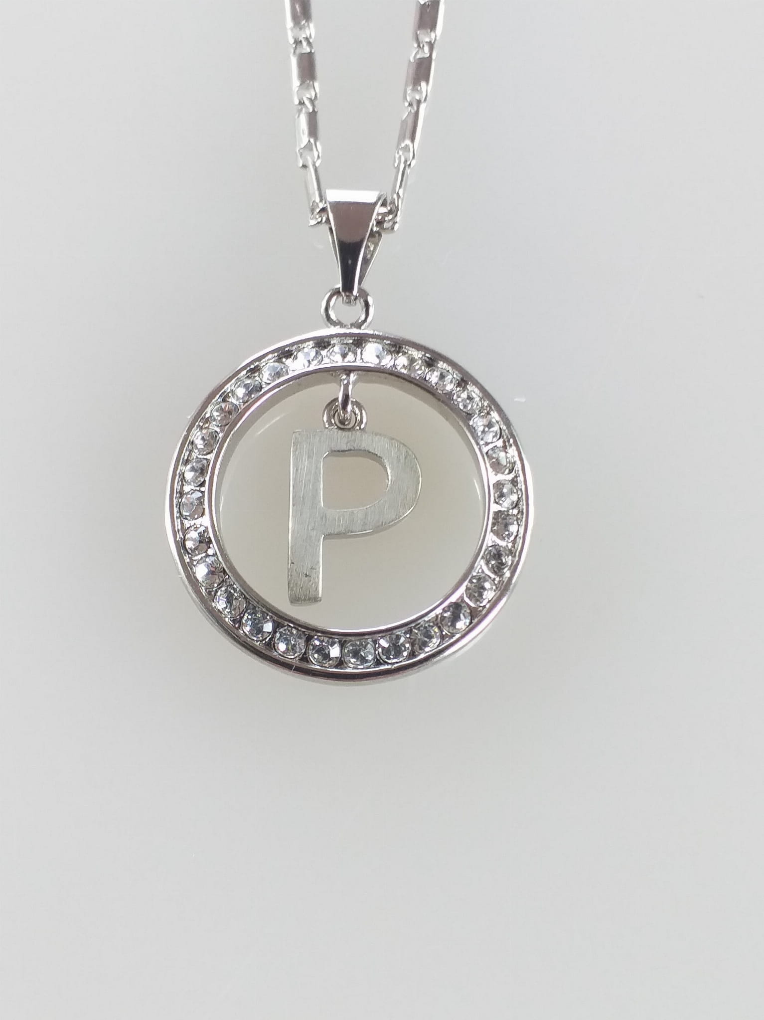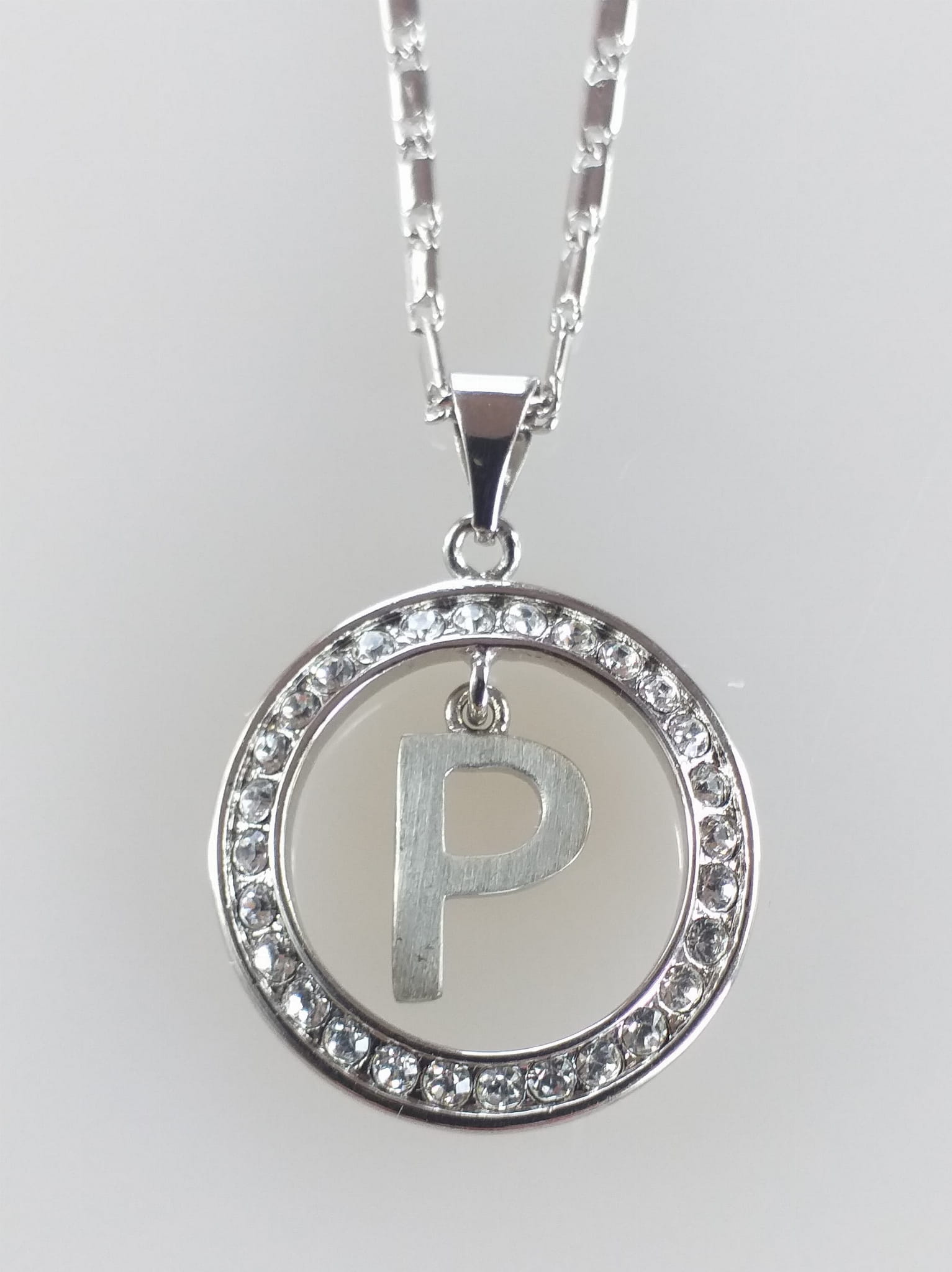 - Łańcuszek z wisiorkiem w kształcie koła z kryształkami Swarovskiego i z literą P w kole