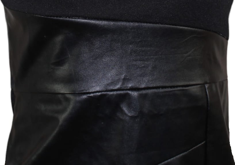 Górna część sukienki jest gładka i minimalistyczna, natomiast dół został wzbogacony efektownymi wstawkami z ekologicznej skóry, które nadają całości wyrazistego, modowego charakteru. Dopasowany krój pięknie akcentuje talię i biodra, a delikatne rozcięcie na dole dodaje lekkości i subtelnej zmysłowości.
