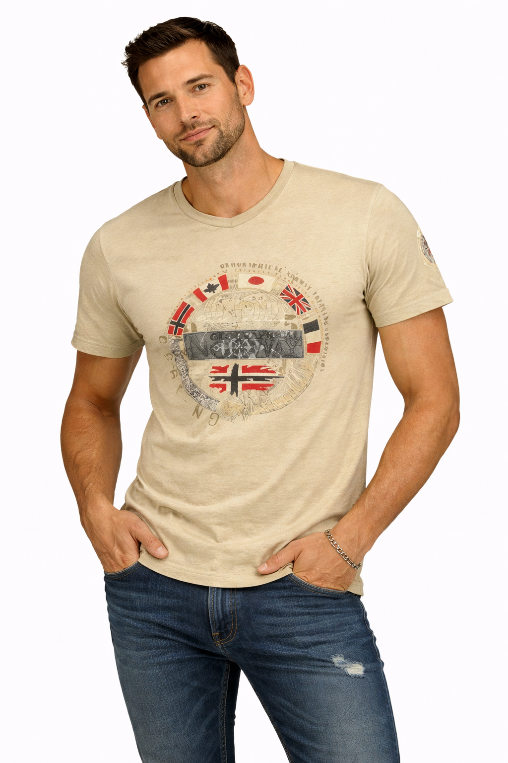 T-shirt męski beżowy bawełna V-neck sportowy na lato JIMPEACH Geographical Norway